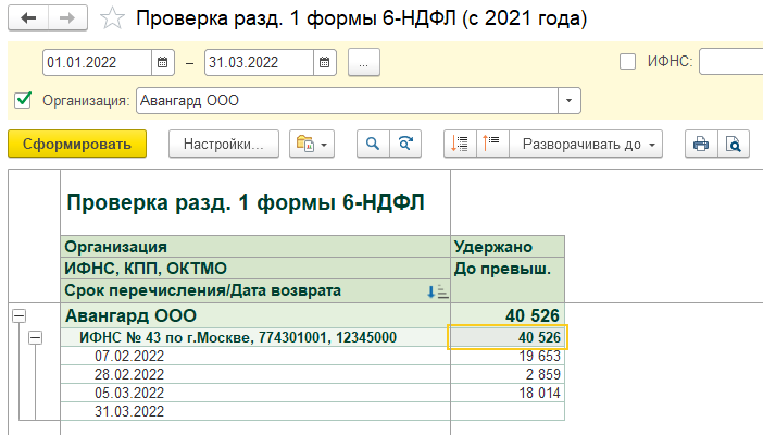 Сумма удержанного налога совпадает со всеми прочими. , например, "Проверка раздела 1 6-НДФЛ".