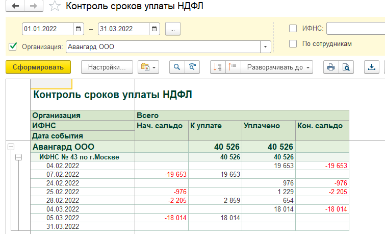 По отчету "Контроль сроков уплаты НДФЛ" установим наличие задолженности по НДФЛ (положительное сальдо отсутствует, значит, задолженности нет).