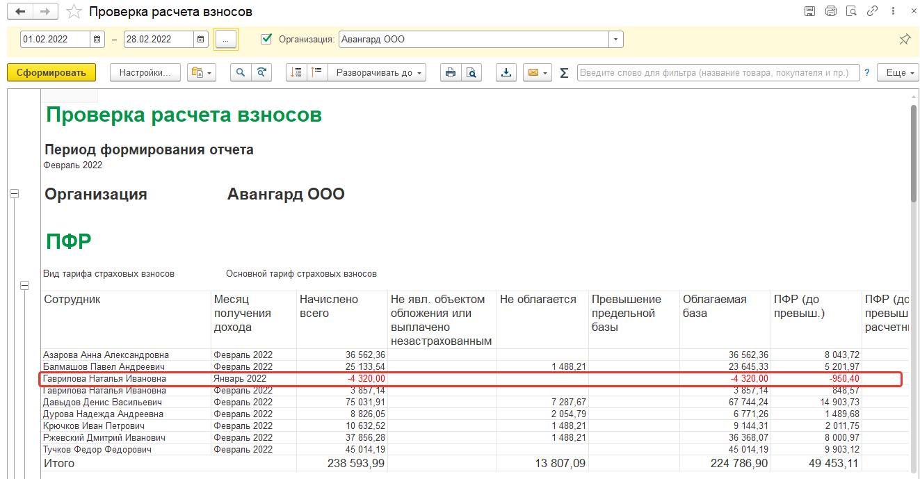 По отчетам проверяем корректность расчета, отсутствие неверных ручных правок в отдельных документах после расчета зарплаты; наличие отрицательных сумм. Так, мы видим отрицательную сумму по перерасчету Гавриловой, которая отразилась в январе, хотя перерасчет был в феврале (не хватило суммы дохода, чтобы покрыть перерасчет, например, перерасчет отпуска никак не виден). Если такая ситуация будет между кварталами, то, скорее всего, потребутся подать корректировку отчета за прошлый квартал. В нашем примере ситуация в рамках одного квартала, следует также сформировать отчет нарастающим итогом, чтобы понять, получается ли в отдельном конкретном месяце положительная сумма.