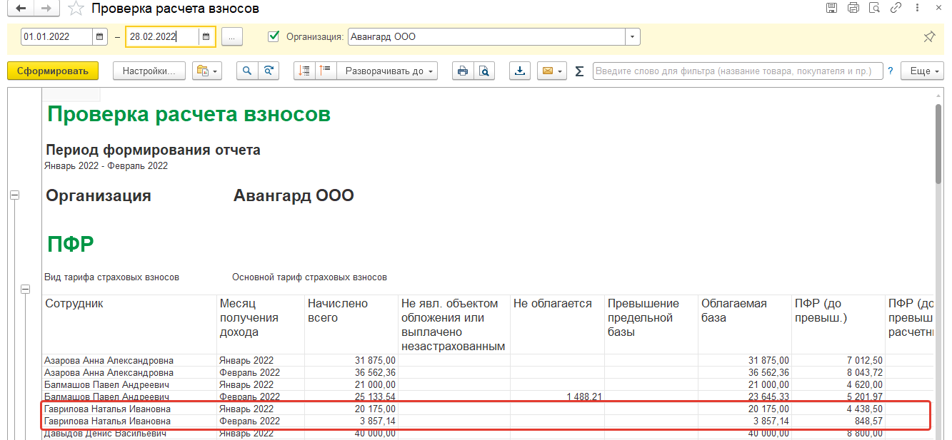 2. Также сформируем отчет "Проверка расчет страховых взносов" для ООО Авангард.