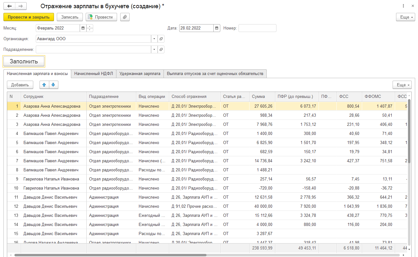1. Сформируем отражение зарплаты в учете за февраль для ООО "Авангард".