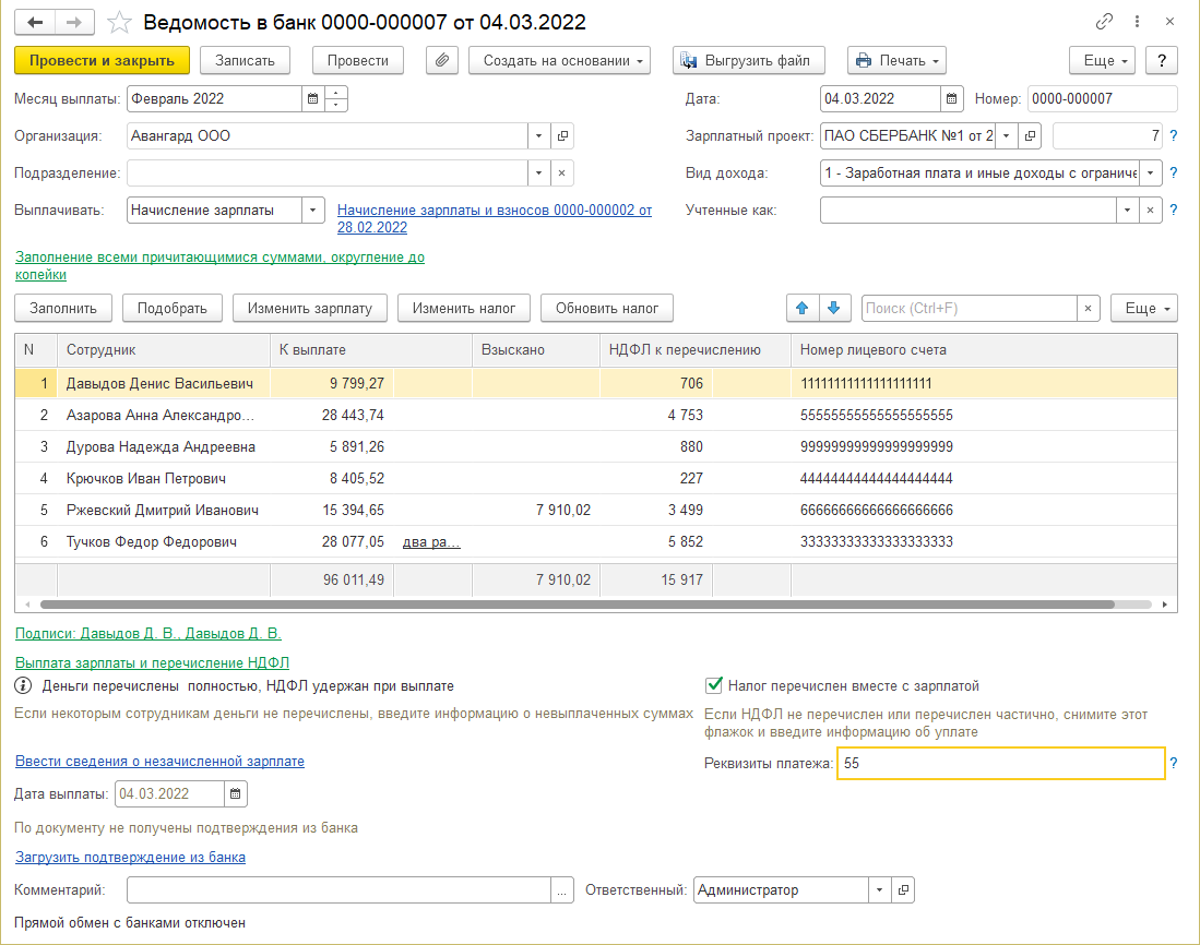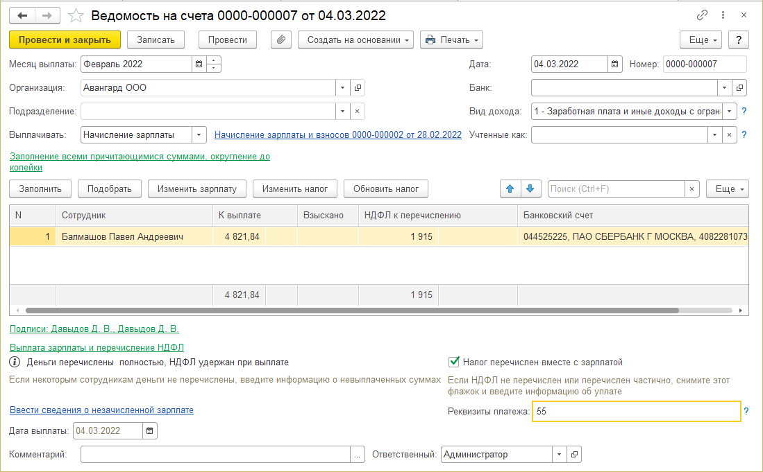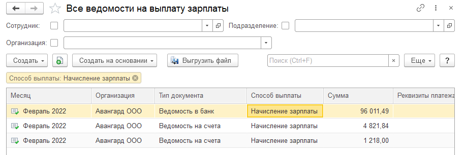 1. Воспользуемся функцией создания ведомостей на выплату на основании документа, начислившего зарплату ООО Авангард.