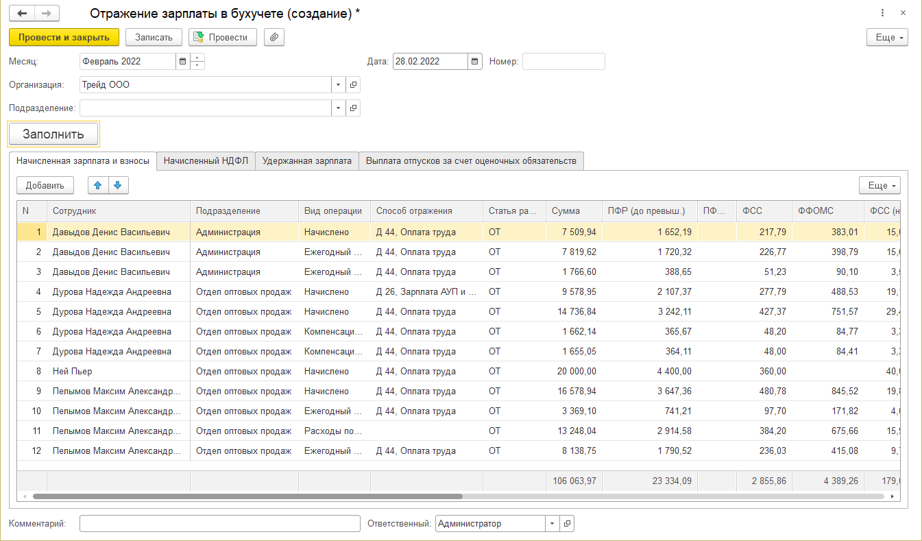 2. Сформируем отражение зарплаты в учете за февраль для ООО "Трейд".