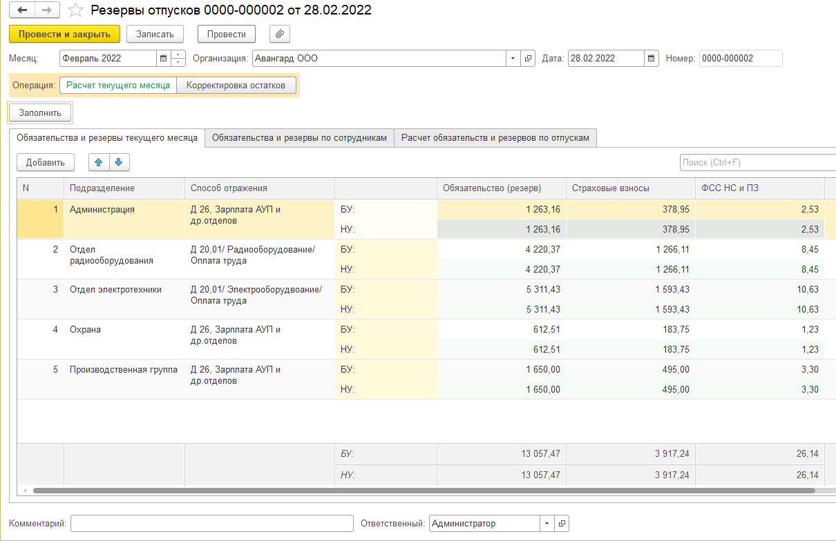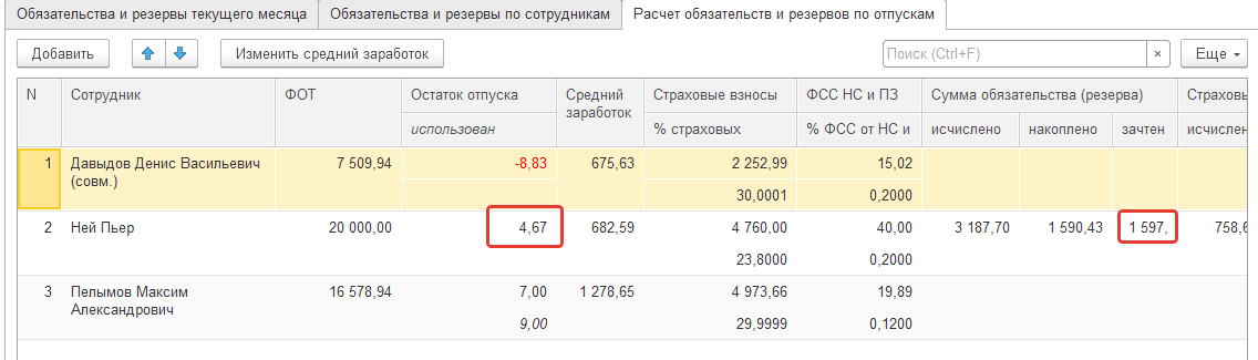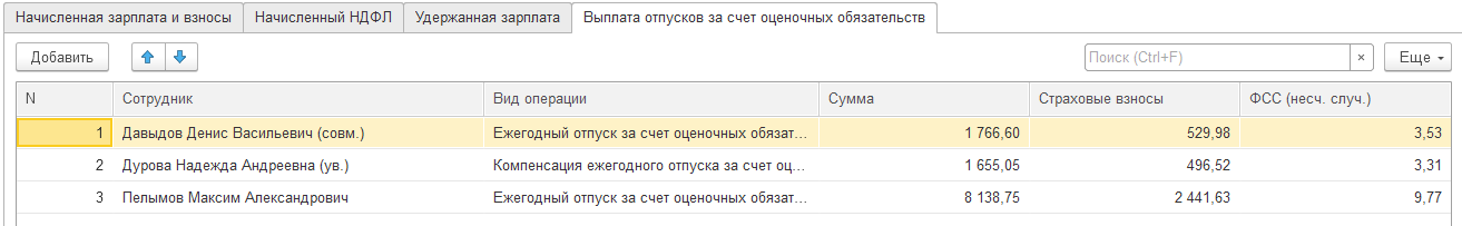 Здесь также сформированы отпуска за счет оценочных обязательств (только в бухучете).