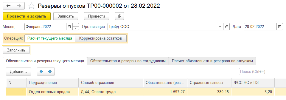 4. Сформируем документ " Резервы отпусков " за февраль для ООО "Трейд".