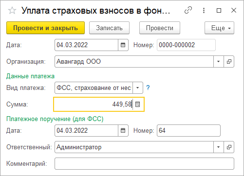 2. Проанализируем сумму к уплате взносов ФСС от НС (по отчетам либо с помощью обработки Платежи по результатам расчета зарплаты). Внесем с помощью документа по уплате сведения о перечислении взносов по травматизму 9пример ниже приведен для ООО Авангард, аналогично сделать для ООО Трейд).
