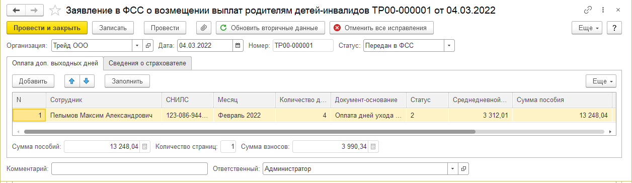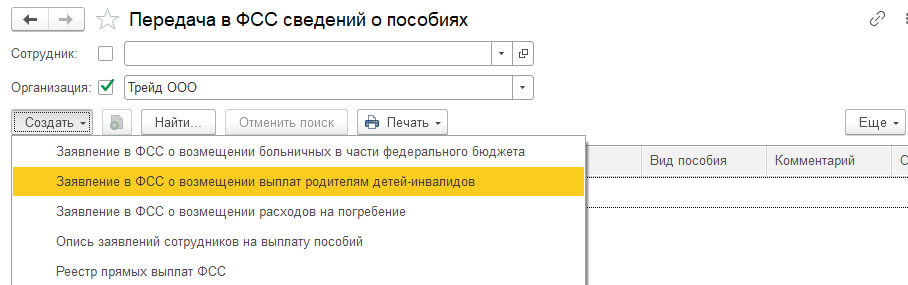 3. Из раздела "Отчетность, справки/ Передача в ФСС сведений о пособиях" создадим документ "Заявление в ФСС о возмещении выплат родителям детей-инвалидов".