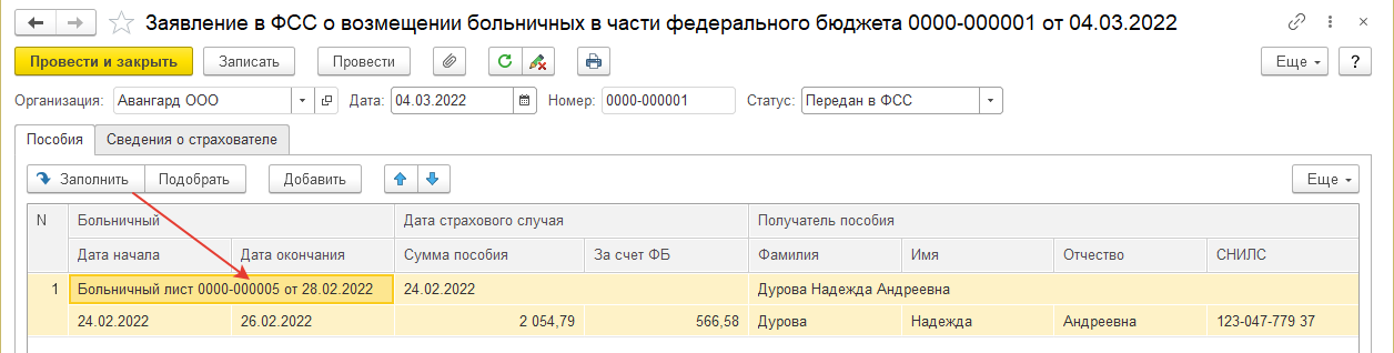 4. Из этого же раздела "Отчетность, справки/ Передача в ФСС сведений о пособиях" создадим документ "Заявление в ФСС о возмещении больничных в части федерального бюджета".