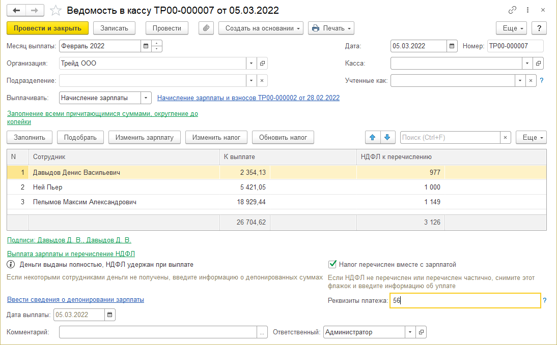 2. Для ООО "Трейд" зарегистрируем выплату через кассу, НДФЛ перечисляется вместе с зарплатой.