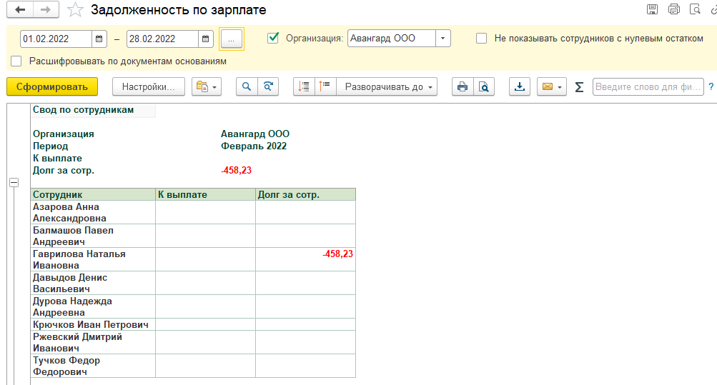 3. Проверим по отчетам раздела "Выплаты" наличие задолженности по зарплате. Есть задолженность по Гавриловой из-за перерасчета, остается до след.месяца.