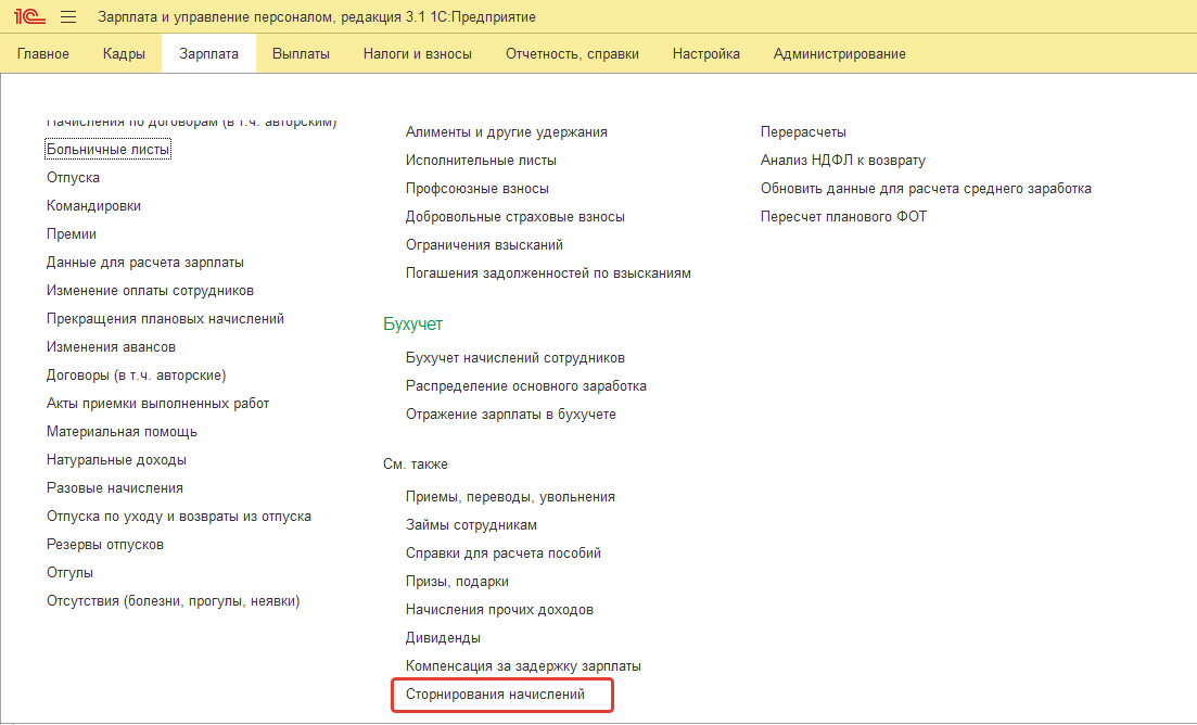 - Из раздела "Зарплата/ Сторнирования начислений"