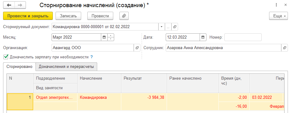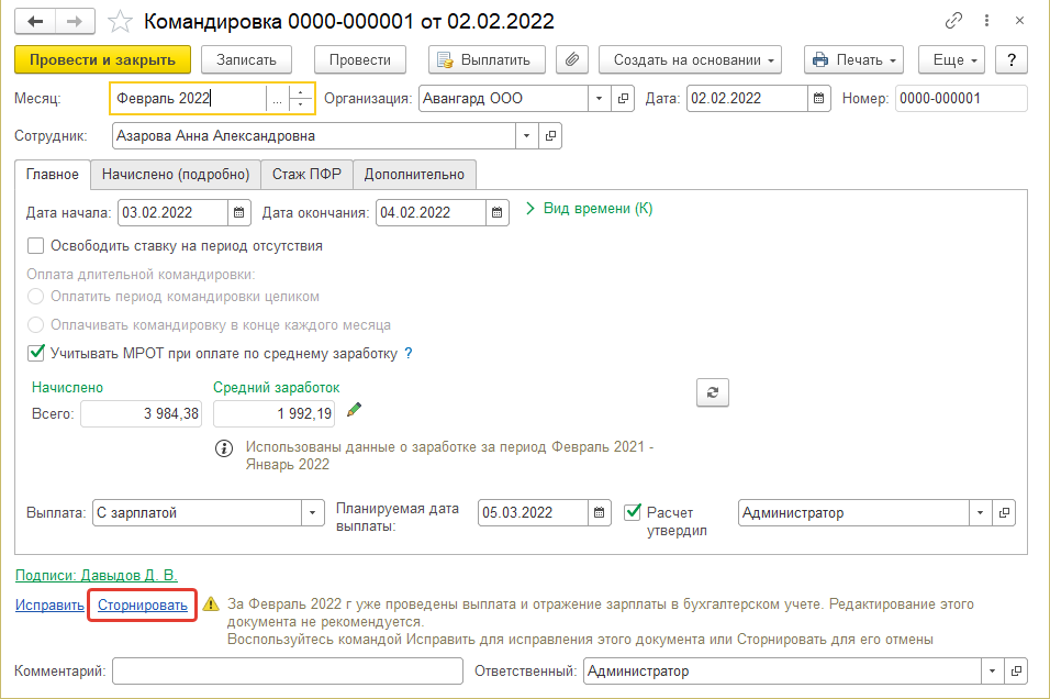 Пример. Сотруднику в феврале был начислена оплата командировки и заработная плата. В марте ему начислена премия по итогам работы за февраль (процентом от оклада по отдельному документу). В марте сотрудник пришел в расчетную группу и сказал, что в командировку он не ездил, а ходил на работу. Но приказ в программе в феврале отменить забыли. Следовательно, документ "Командировка" необходимо сторнировать. При этом данное действие повлечет за собой: доначисление зарплаты за февраль, перерасчет премии в марте, перерасчет НДФЛ и страховых взносов в марте за февраль.
