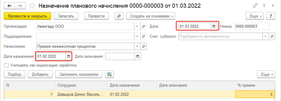 Для этого введем постоянное начисление документом "Назначение планового начисления" с 01.02.2022: назначим премию в размере 5% (обратите внимание на то, что подобный ввод данных возможен только при неустановленной дате запрета изменения прошлых периодов в данном месяце). После этого необходимо выполнить перерасчет зарплаты за февраль по данному сотруднику.