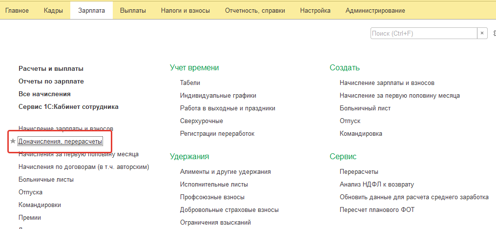 Вариант 2. Если же в настройке расчета зарплаты программы отмечен флаг "Выполнять доначисление и перерасчет отдельным документом" либо пользователю необходимо выполнить перерасчет в течение расчетного периода (месяца) отдельно от основной зарплаты, то создается отдельный документ "Доначисления, перерасчеты". Данный документ можно вывести на панель навигации раздела "Зарплата" (так, как было сделано нами в разделе "Окно конфигурации").