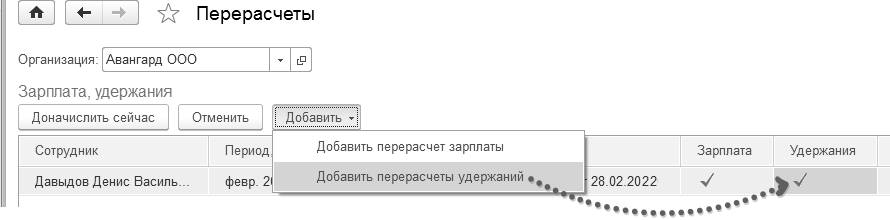 Обратите внимание, что в обработку можно добавлять перерасчеты начислений и удержаний и вручную.