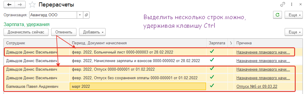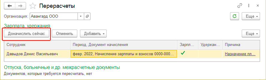 Данные строки следует убрать из обработки перерасчета: кликом правой клавиши на строку указать – отменить. Должна остаться только строка по Давыдову Д.В. – начисление зарплаты. Чтобы провести доначисление, необходимо нажать команду "Доначислить сейчас" - будет создан документ "Доначисления, перерасчеты".