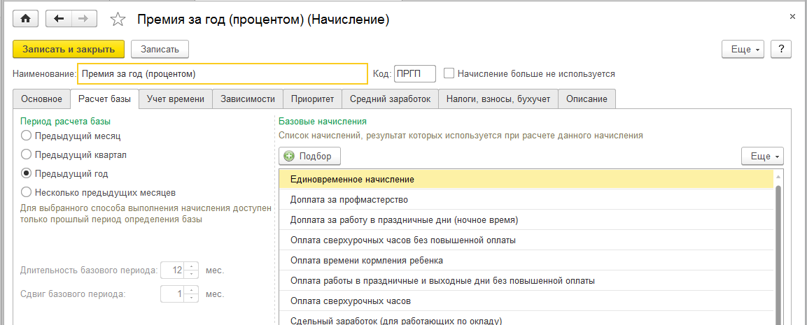 В документе "Премия" базовый период по умолчанию будет определяться автоматически и при необходимости его можно будет скорректировать вручную.