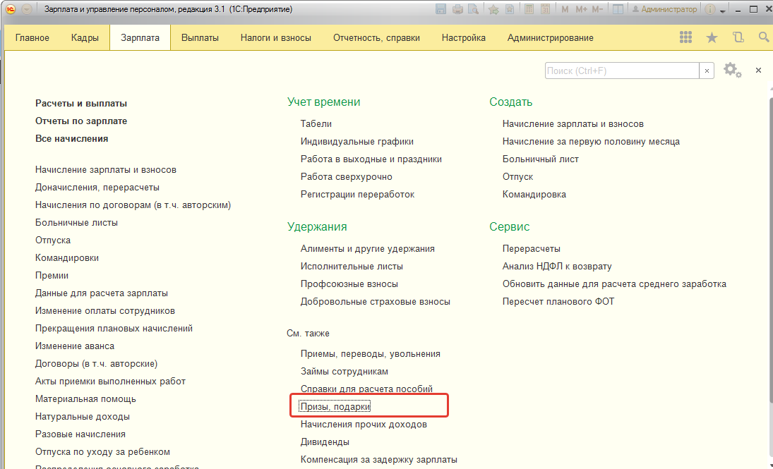 Сотруднику Тучкову Ф.Ф. 31.03.2022 выдали подарок на сумму 3000 руб., подарок не облагается страховыми взносами (по мнению руководителя, как выплата не по коллективному договору, а по договору дарения), зарегистрируем доход сотрудника с помощью документа "Призы, подарки".