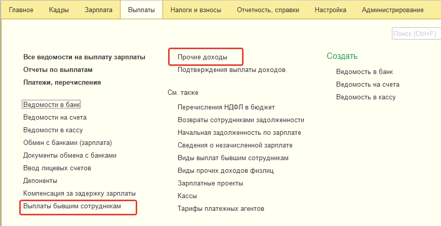 Данный документ для регистрации доходов физическим лицам с ролью "бывший сотрудник", доходы перечислены в справочнике "Виды выплат бывшим сотрудникам". Ввод документа доступен при соответствующих настройках расчета зарплаты программы для физических лиц, к которым созданы сотрудники (при этом сами сотрудники уже уволены).