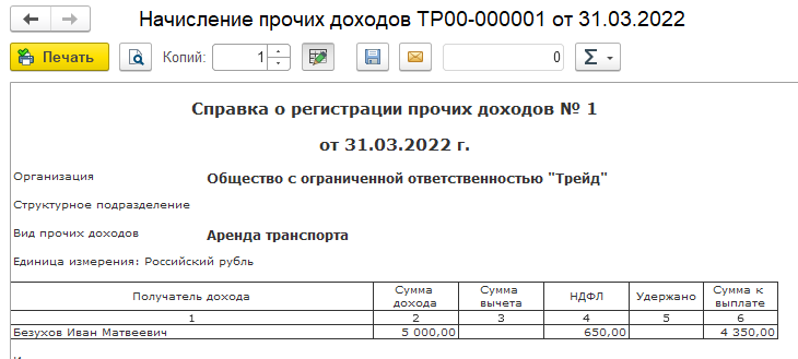 Физическому лицу Безухову И.М., не состоящему в трудовых отношениях с ООО "Трейд", начислен 31.03.2022 доход в виде аренды автотранспорта в размере 5 000 руб.