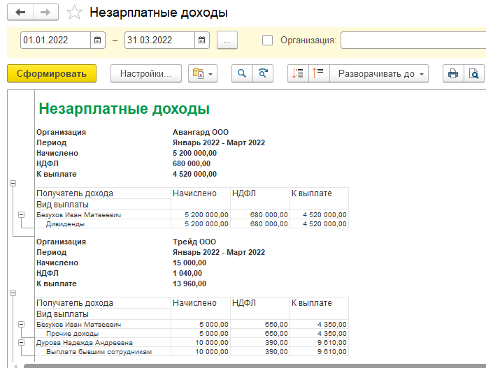 В разделе "Выплаты / Отчеты по выплатам" можно сформировать отчет по незарплатным доходам.
