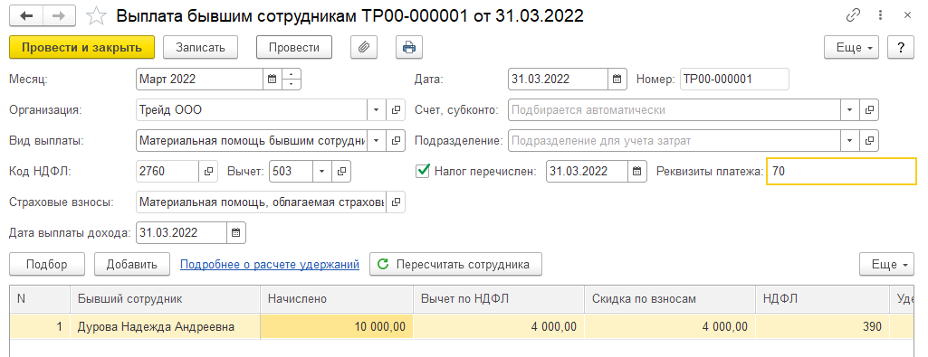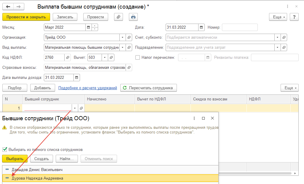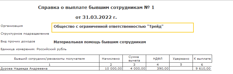 Бывшей сотруднице ООО "Трейд" Дуровой Н.А. 31.03.2022 начислена материальная помощь как бывшему работнику. Зарегистрируем доход с помощью документа "Выплата
