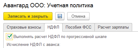 При регистрации доходов свыше 5 млн. в учетной политике автоматически взводится флаг "Выполнять расчет НДФЛ по прогрессивной шкале" (следует проверить данную настройку, при необходимости подтвердить и пересчитать результат в документе). НДФЛ должен рассчитаться двумя частями: по ставкам 13 и 15%.