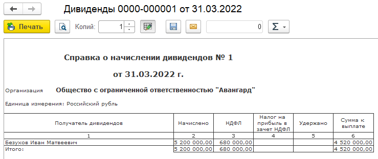 В ООО "Авангард" 31.03.2022 начислены дивиденды акционеру, который не является сотрудником данной организации, – Безухову И.М. В нашей учебной базе такое физическое лицо уже есть в справочнике "Физические лица". Сотрудник к нему не создается. Зарегистрируем данный доход с помощью документа "Дивиденды" на 31.03.2022, создав его из раздела "Выплаты/ Прочие доходы". При заполнении документа необходимо выбрать данного человека из полного списка физических лиц (как в практикуме выше). Сумму дохода устанавливаем большую – превышающую порог прогрессивной ставки НДФЛ, - 5,2 млн.руб.