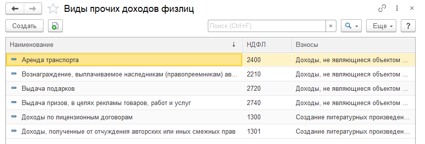 Такое физическое лицо уже есть в учебной базе, необходимо зарегистрировать незарплатный доход, создав документ "Начисление прочих доходов" из раздела "Выплаты/ Прочие доходы". Проведем документ. Выведем на печать справку о регистрации прочих доходов.