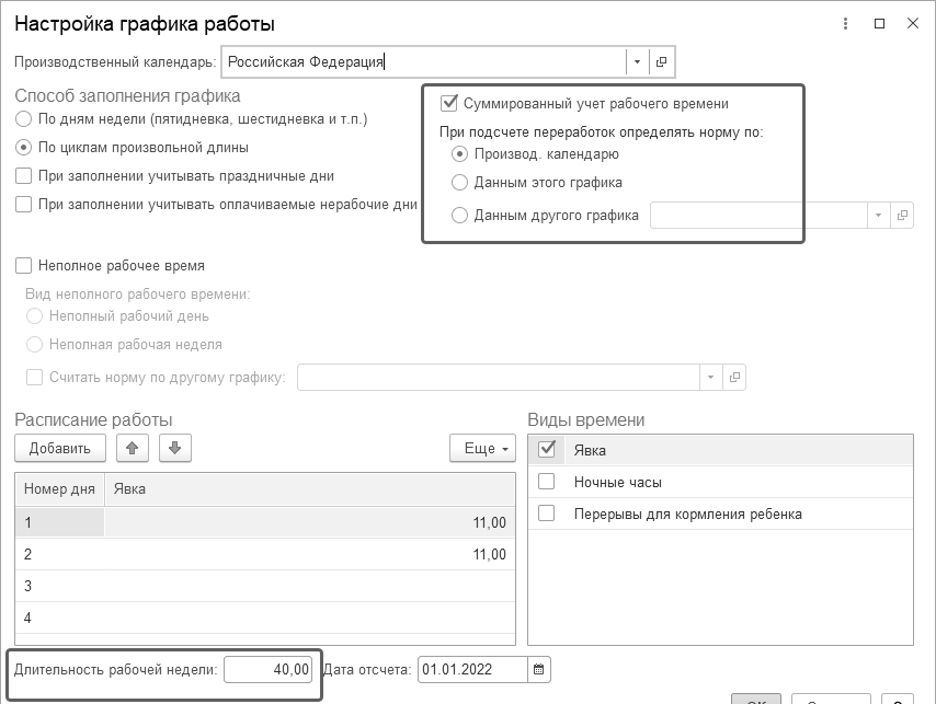 При ведении суммированного учета рабочего времени у сотрудника может возникнуть ситуация, когда он проработал больше нормы часов по производственному календарю. Такая ситуация называется переработкой. В программе существует возможность оплачивать время переработок. Напомним, что она включается в настройках расчета зарплаты программы (настройка состава начислений и удержаний/ почасовая оплата). Признак суммированного учета, а также порядок определения нормы часов и количество рабочих часов в неделю устанавливается в настройках графика работы.