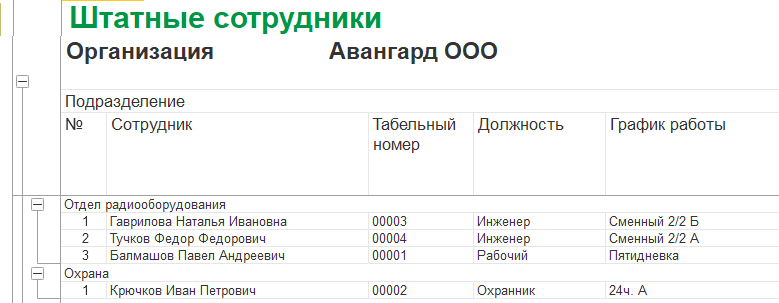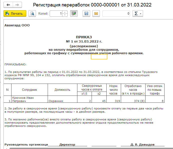Такой график суммированного учета должен быть установлен сотруднику кадровыми документами. В нашей учебной базе такие сотрудники работают в ООО "Авангард".