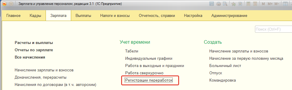 Чтобы зарегистрировать переработки при суммированном учете, следует воспользоваться документом "Регистрация переработок". Документ вызывается из раздела "Зарплата" (либо "Кадры/ Сверхурочные, переработки").
