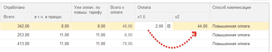 Норма определяется по настройке, заданной в графике работы (по производственному календарю, другому графику и т.п.) за вычетом времени невыходов. Фактически отработанное время определяется также, как и в табеле учета рабочего времени. В текущей версии программы по умолчанию все часы переработок заполняются в колонку для их "полуторной" оплаты. Часы двойной оплаты необходимо выделить самостоятельно в соответствии с принятой на предприятия методикой. При заполнении одной из колонок часов оплаты, другая автоматически пересчитывается.