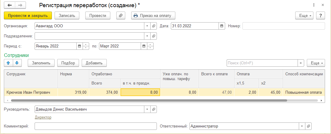 Заполним документ автоматически по команде "Заполнить". Укажем 2 ч. в 1,5 размере, остальные в двойном. Способ компенсации – повышенная оплата.