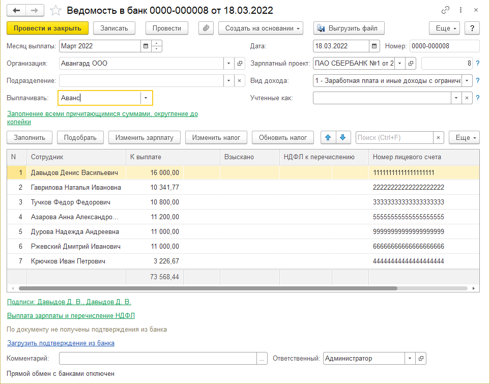Зарегистрируем выплату аванса для ООО "Авангард" 18.03.2022.