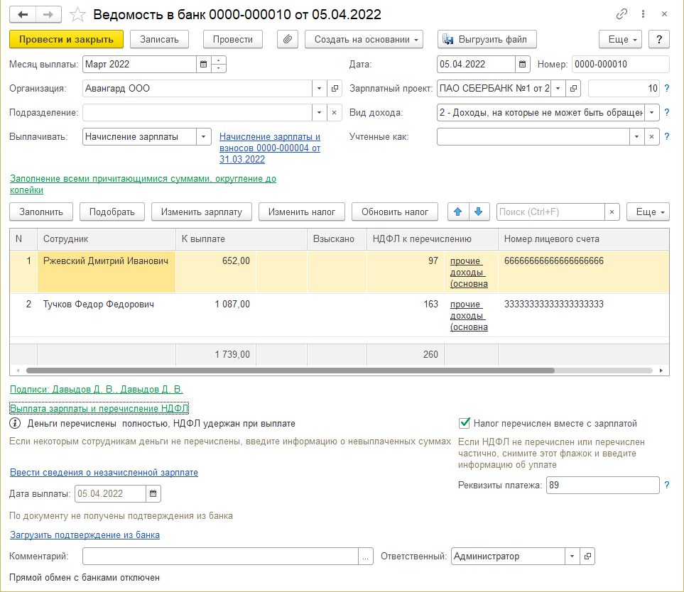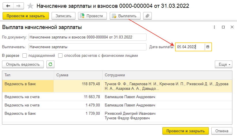 Выплатим зарплату через банк и на лицевые счета 05.04.2022, документы на выплату можно создать на основании начисления зарплаты.