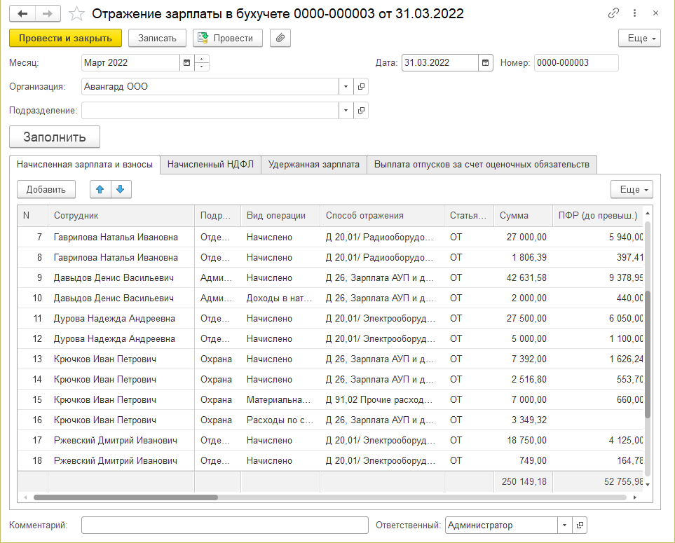 1. Начислим заработную плату за месяц март всем сотрудникам ООО "Авангард".