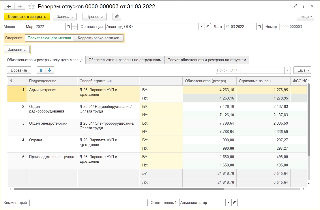 2. Создадим и автоматически заполним документ "Резервы отпусков".