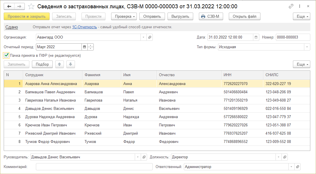 1. Создадим и автоматически заполним документ "Сведения о застрахованных лицах, СЗВ-М" за март 2022г. Отчет СЗВ-ТД подавать не требуется, т.к. в этом месяце не было кадровых движений.