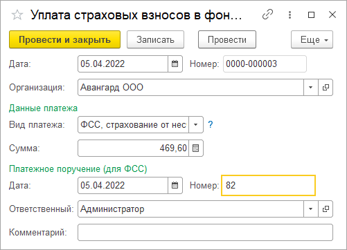 2. Определим сумму к уплате в ФСС от НС и зарегистрируем ее документом "Уплата страховых взносов в фонды".