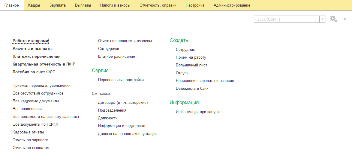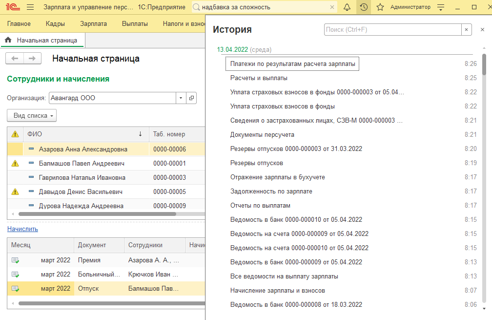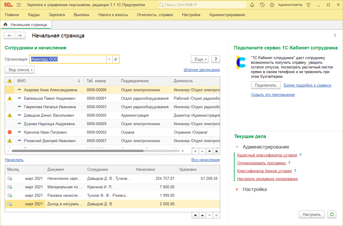 В изучаемой конфигурации разработаны средства для помощи пользователю в быстром оформлении документов. Начальная страница – по умолчанию отображает список сотрудников, также позволяет вводить ряд расчетных документов. Организация, выбранная на этой странице, будет указана, как организация по умолчанию для добавляемых документов.