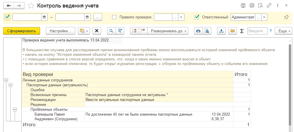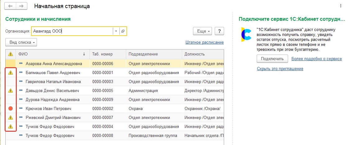 Нажав на значок, можно получить отчет об ошибках (см. справочник Сотрудники).