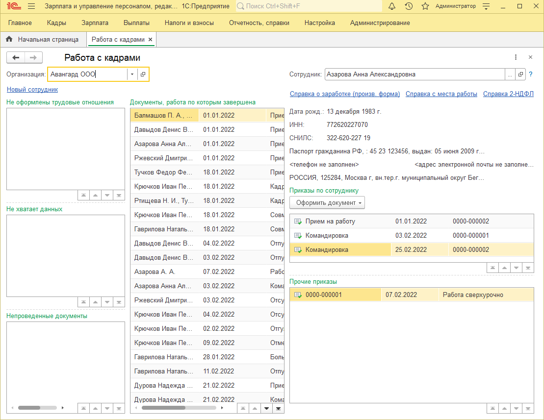 Помощник работы с кадрами (раздел "Кадры / Работа с кадрами") позволяет просматривать, вводить и редактировать кадровые приказы, контролировать заполнение личных данных сотрудников, выявлять непроведенные документы.