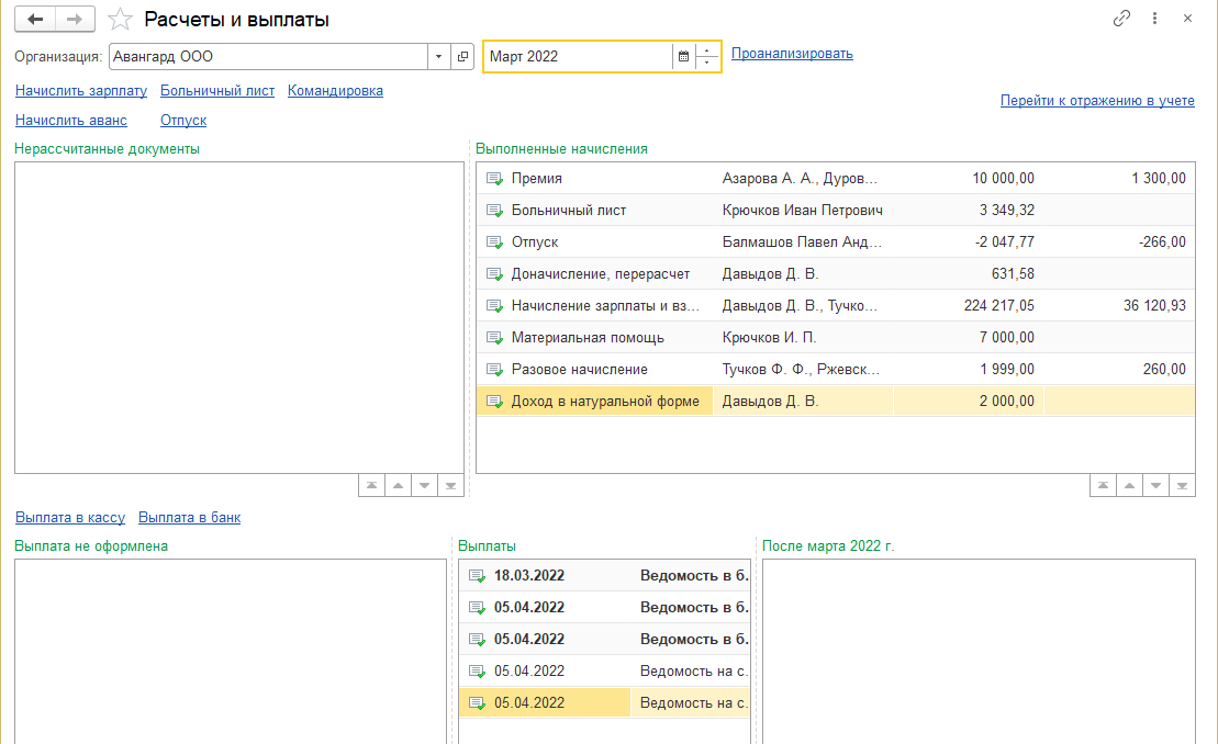 Помощник работы с зарплатой (раздел "Зарплата /Расчеты и выплата") позволяет анализировать нерассчитанные документы, введенные кадровой службой, просматривать выполненные начисления и выплаты (в том числе документы следующих месяцев), анализировать задолженность.
