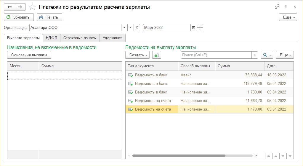 Помощник формирования платежей по результатам расчета зарплаты (раздел "Выплаты/ Платежи, перечисления") позволяет проанализировать контрагентов, в пользу которых производились удержания, суммы страховых взносов, документы по выплате зарплаты через банк по зарплатному проекту и т.п.