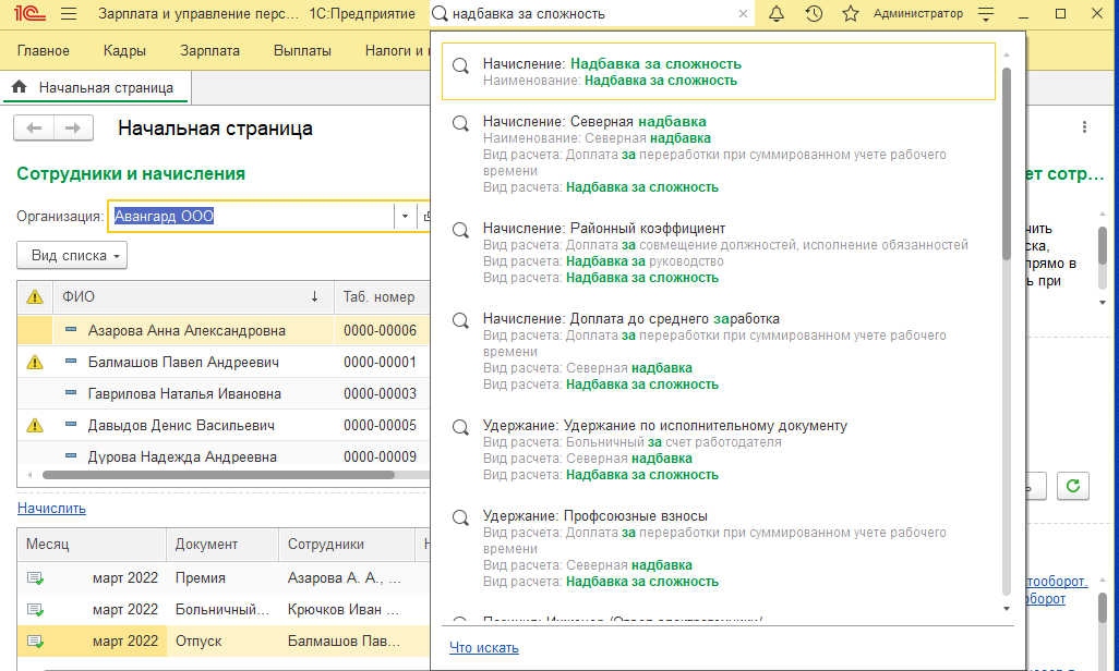 Например, пользователь некорректно настроил надбавку за сложность и теперь хочет оценить, где она используется, чтобы принять решение о корректировке или создании нового начисления. Набрав в поиске "надбавка за сложность", пользователь получает и те объекты, в настройках которых встречается надбавка, и документы, в которых она упоминается.