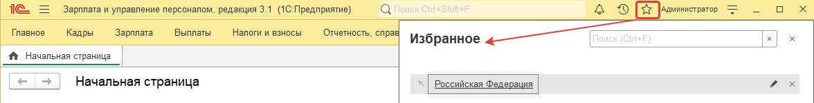 Избранное. Пользователь может составить относить объекты к избранным, если он часто ими пользуется, и ему удобно находить их в интерфейсе таким образом. Например, пользователю постоянно приходится смотреть производственный календарь. Для того, чтобы открыть его, необходимо перейти в раздел "Настройка / Производственный календарь / Производственный календарь по РФ". Это может быть не очень удобно делать часто, особенно при удаленной работе с планшета или смартфона.