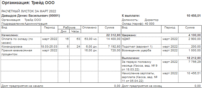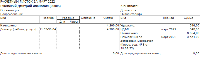 4. Из заработка сотрудника Давыдова Д.В. 31.03.2022 удерживается невозвращенный подотчет в размере 200 руб.