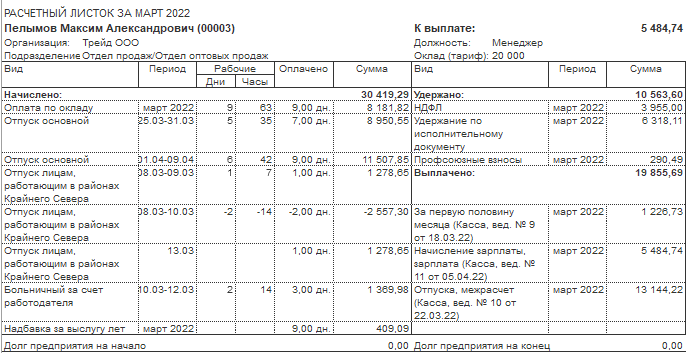 3. Сотруднику Пелымов М.А. 22.03.2022 начислены и выплачены отпускные: основной отпуск с 25.03.2022 по 09.04.2022 (НДФЛ перечислен п/п № 94).