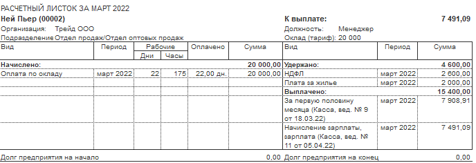 1. Произвести расчет зарплаты за первую половину месяца. НДФЛ можно учесть любым удобным способом. Выплатить рассчитанный аванс 18.03.22 через кассу.